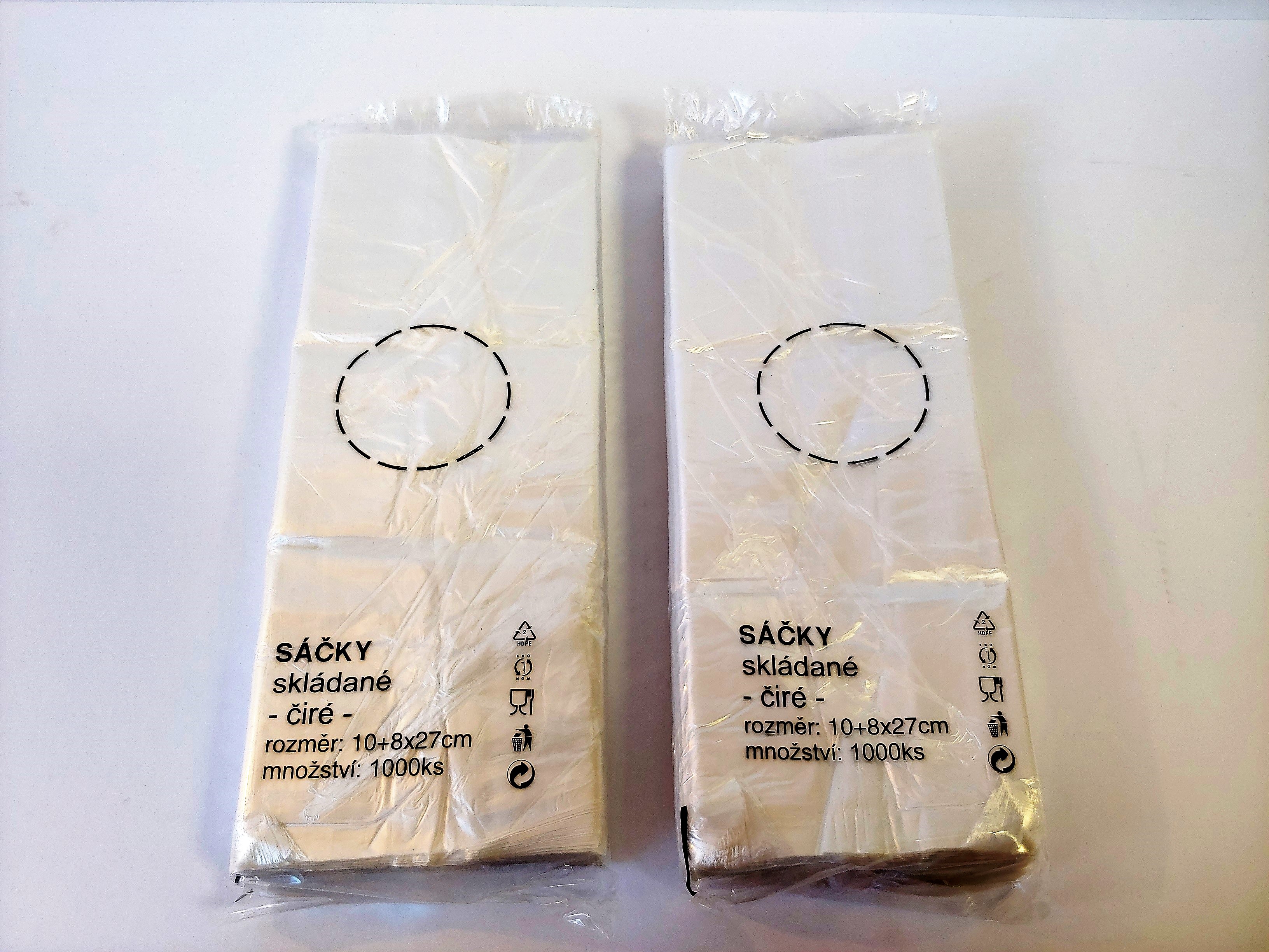 Obj.kód PS1 mikrotenové sáčky skládané v přebalu po 1000 ks. Z přebalu se vytahují kruhovým otvorem.
