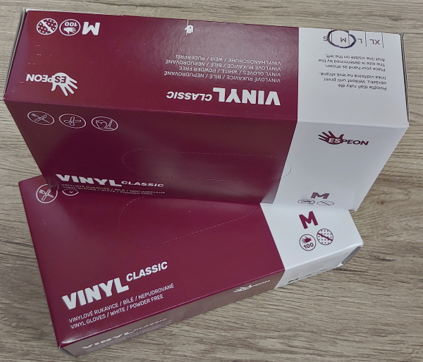 Vinylové rukavice velikosti M a v krabičce jsou po 100 ks.